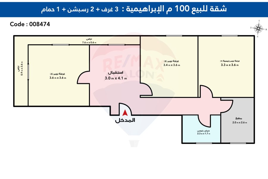 شقة للبيع 100 م الإبراهيمية (عمودي علي الترام) - 800,000 ج كاش -