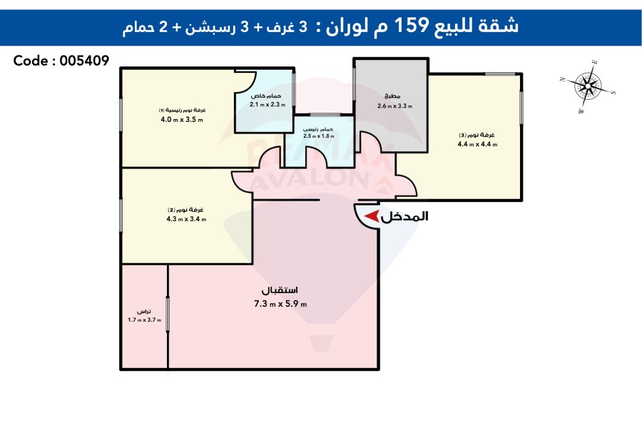 • 3 غرف نوم 3 ريسبشن 2 حمام.