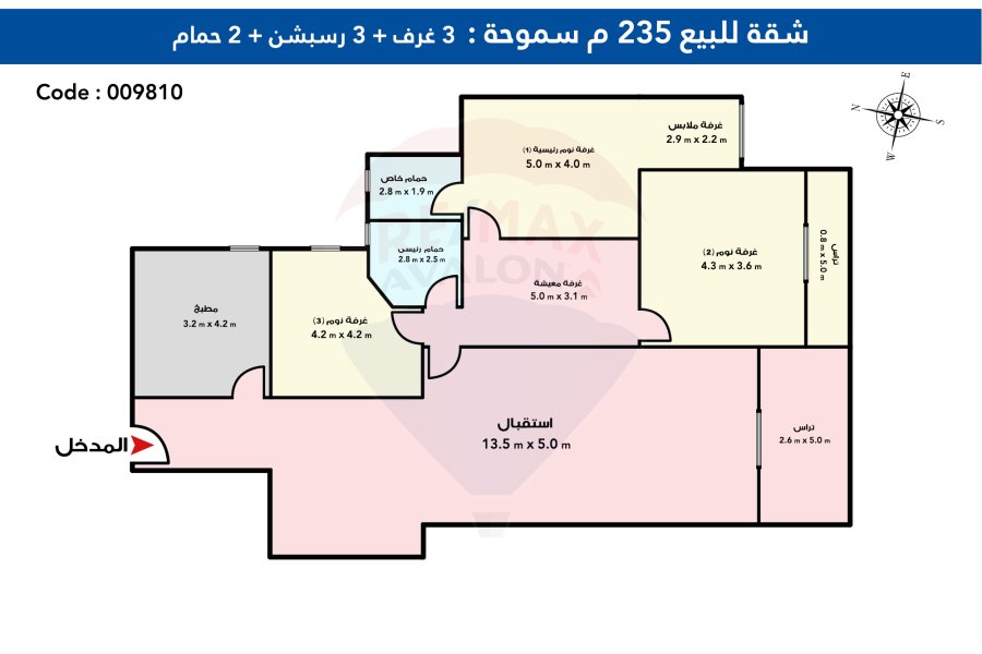 • 3 غرف نوم 3 ريسبشن 2 حمام.